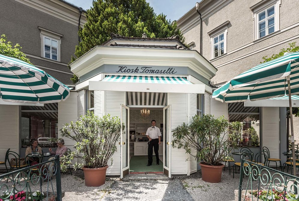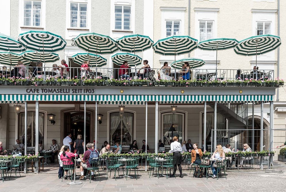 Hier hat die österreichische Kaffeehauskultur ihren Ursprung. Gegründet 1700, ist das Tomaselli Österreichs ältestes Café. Neben Kaffeeklassikern ist aber auch das Eis, das mit großer Sorgfalt erzeugt wird, nicht zu verachten. Für den Mozart-Becher wird eigens ein Mandeleis kreiert. Hausgemacht sind die Fruchtsaucen aus Erdbeeren und Sauerkirschen und die Dekoration, von Marzipanschmetterlingen über Harfen und Notenschlüssel aus Baisermasse bis zu den Rothschildbiskotten, die mit Haselnüssen bestreut und in Schokolade getunkt die Eisbecher zieren.