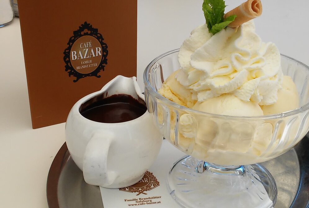 Was das „Tomaselli“ für die Altstadt links der Salzach, ist das „Bazar“ für das rechte Flussufer – Kaffeehaustradition in Reinkultur! Edles Ambiente, exzellenter Service, Speisen und Getränke von bester Güte, nicht zu vergessen auch das Eis. Hier gibt es den klassischen Cup Dänemark in Deluxe-Ausführung: solides Vanilleeis mit Schlagobers und Minzblättchen und dazu warme (!!!) Schokoladensauce im Kännchen, die schmeckt wie hausgemachte Kuvertüre mit Butter bei Mama. Mit Blick auf die Salzburg-Kulisse und einem kleinen Lüftchen von der Salzach ergibt das einen perfekten Sommertag.