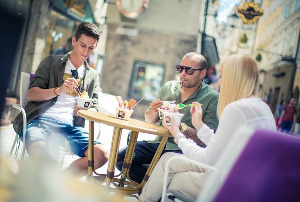 Mit Blick auf die Bürgerspitalkirche und das geschäftige Treiben der Getreidegasse lässt es sich seit kurzem Frozen Joghurt in Bio-Qualität genießen, zB mit frischen Erdbeeren, Schokosauce und Crispies. Laufend gibt es neue Toppings und die Fülle an extra erfrischenden Kreationsmöglichkeiten kennt keine Grenzen.