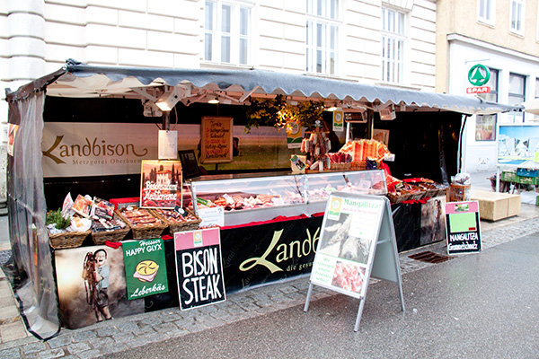 Während das Fleischangebot am Wochenmarkt zu früheren Zeiten relativ gering war, bietet die Salzburger Schranne heute eine gewaltige Auswahl.