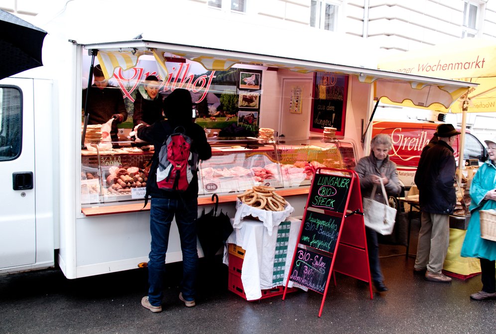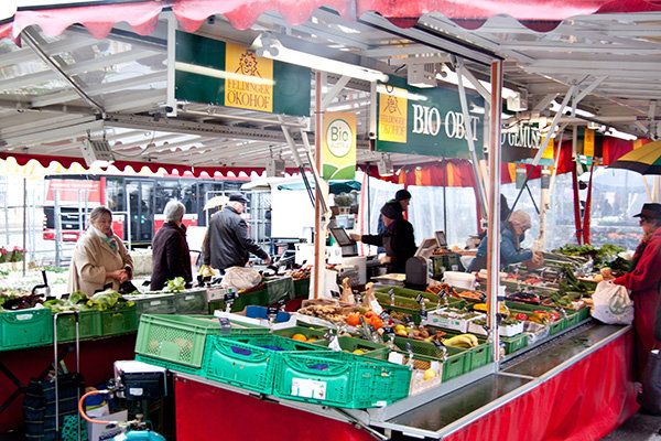 Tierische Produkte und vor allem Fleisch, waren noch vor über 100 Jahren vor allem der höher gestellten Gesellschaft vorbehalten. Das Fußvolk ernährte sich vorwiegend von heimischen Gemüsesorten und Brot. Selbst bestimmte Obstsorten waren eine Besonderheit und wurden in Delikatessen Geschäften oder von sogenannten Lemoni Händlern angeboten, die mit Zitrusfrüchten extra aus Italien anreisten. Heute kann man sich vor allem im Bio-Bereich über ein großes und qualitativ hochwertiges Obst- und Gemüsangebot auf der Schranne freuen.