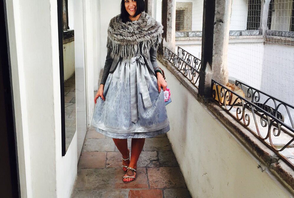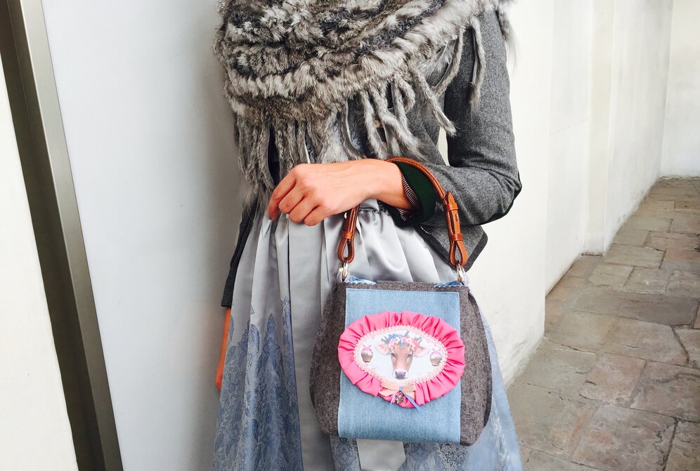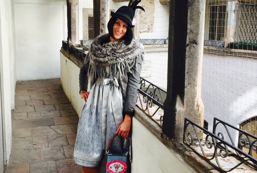 Tracht im ganz großen Stil ist im Hause Dollinger zu finden. Ich habe mich in ein wunderschönes Seidendirndl aus dem Hause Tramontana verliebt. Das Dirndl wie auch die Bluse sind mit zauberhaften Spitzendetails verarbeitet und der Unterrock lässt das Kleid perfekt fallen. Darüber trage ich eine klassische Lodenjacke und einen Überwurf aus Kaninchenfell. Besonders schön sind auch hier wieder die Accessoires – die Kropfkette, die freche Tasche und der Hut vollenden das Outfit.