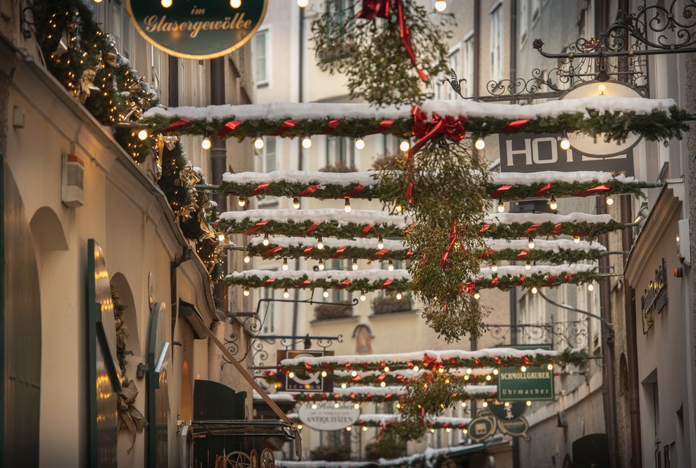 Selten präsentiert sich die Salzburger Altstadt zauberhafter als in der Vorweihnachtszeit. Prunkvoll dekorierte Auslagen, festlich beleuchtete Gassen und über