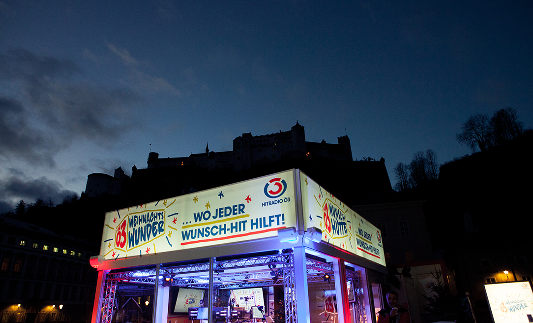 Heuer kommt das große Spendenfest der Ö3-Gemeinde zurück an seinen Premierenort: Wie schon 2014 steht die Ö3-Wunschhütte direkt am Kapitelplatz mitten in Salzburg. Aus dem gläsernen Studio sendet Hitradio Ö3 fünf Tage lang rund um die Uhr. Für insgesamt 120 Stunden wird dieser Ort also der besondere Rahmen für ein Ö3-Herzensanliegen, hör- und sichtbar in ganz Österreich. Hinkommen oder zuhören oder streamen, miteinander eine gute Zeit verbringen und helfen. Gemeinsam lassen wir das Ö3-Weihnachtswunder wahr werden! Alle Informationen finden Sie auf der Website des Ö3-Weihnachtswunders.