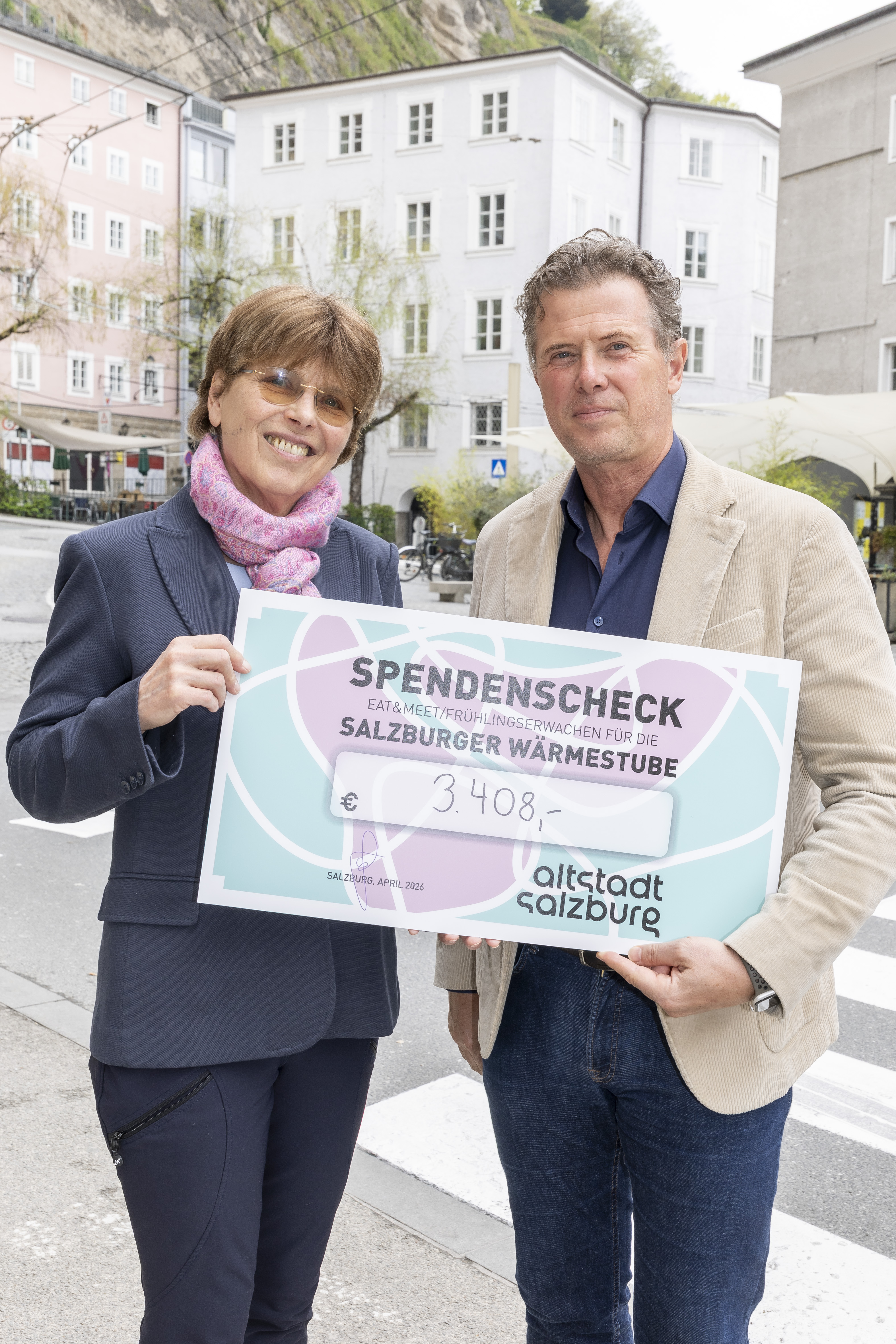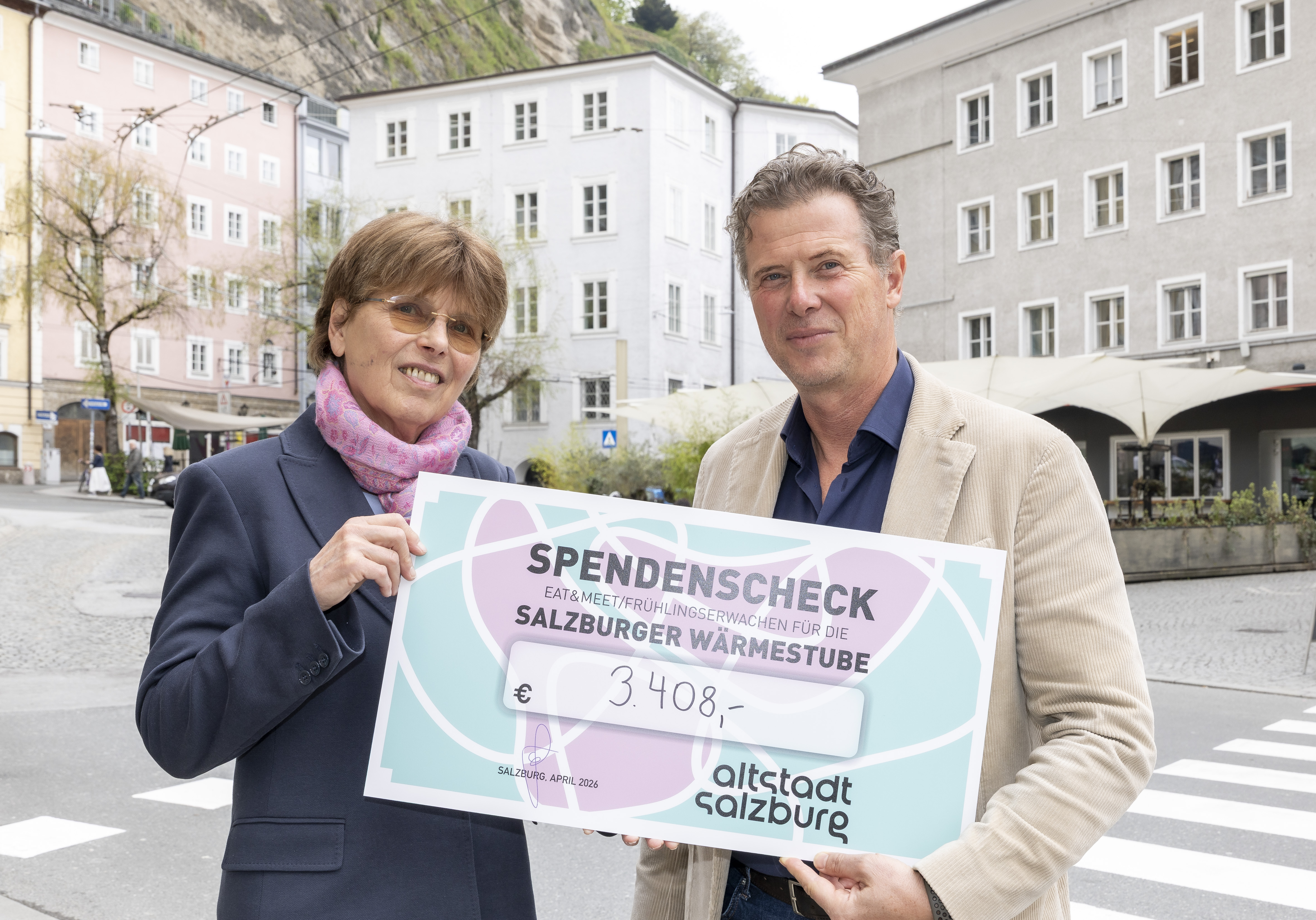 Der gesamte Erlös in der Höhe von 3.408 Euro wurde am Mittwoch, 15. April 2026, von Altstadtverband-Geschäftsführer Roland Aigner an Marie Orsini-Rosenberg, Obfrau der Salzburger Wärmestube, übergeben. „Mit dieser Initiative unterstreicht der Altstadtverband Salzburg einmal mehr das soziale Engagement der Altstadt-Unternehmer:innen sowie die Bedeutung gemeinschaftlicher Unterstützung für Menschen in schwierigen Lebenssituationen“, freut sich Roland Aigner über die gelungene Spendenaktion des Altstadtverbandes Salzburg in Kooperation mit seinen Mitgliedsbetrieben.