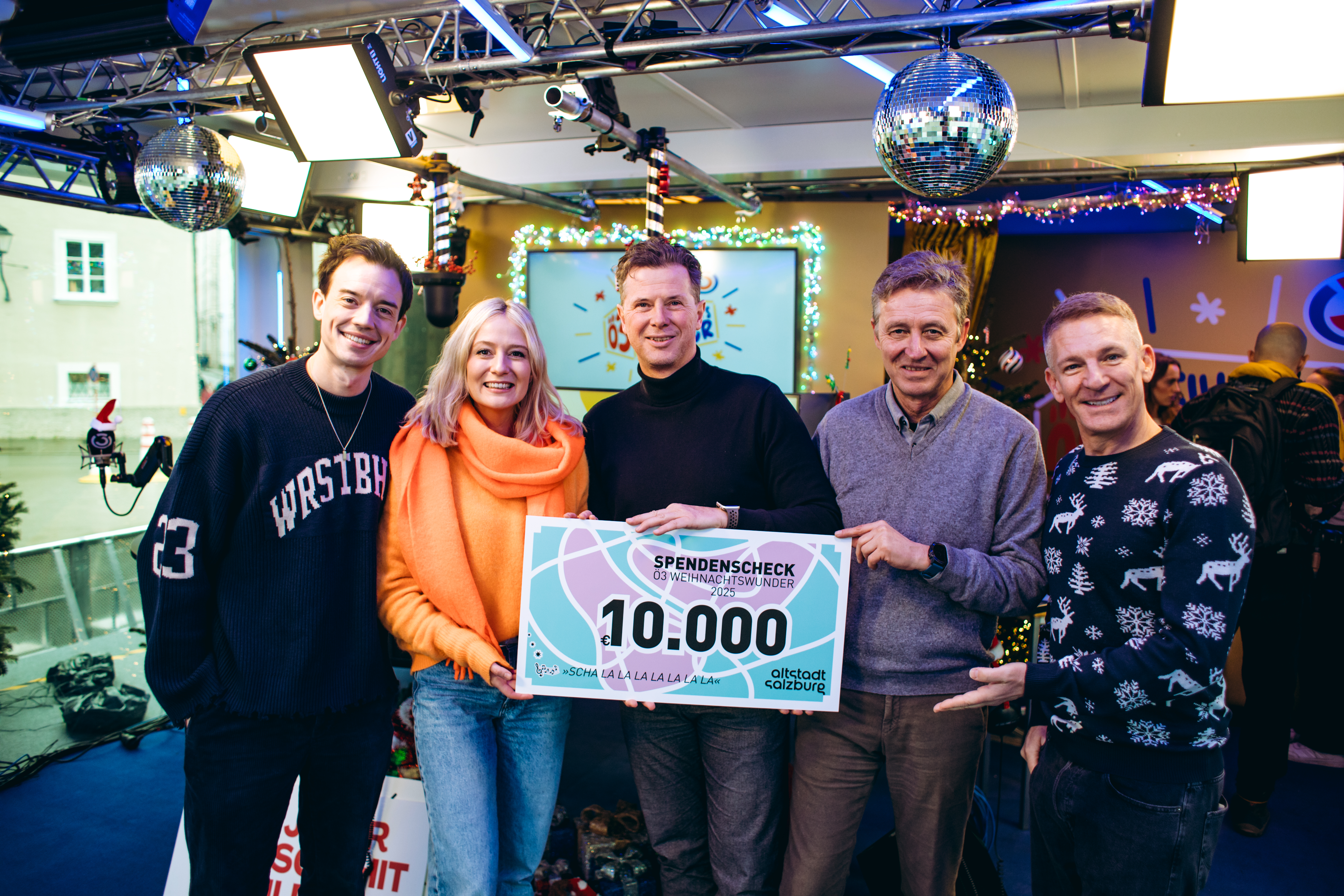 Im Zeitraum vom 20. November bis einschließlich 22. Dezember 2025 verkaufte der Altstadtverband Salzburg Gutscheine im Wert von rund einer Million Euro. „Altstadt Gutscheine sind auch heuer wieder ein beliebtes Weihnachtsgeschenk. Sie werden bei über 600 Altstadt-Unternehmen als Zahlungsmittel angenommen. Der Altstadt Gutschein-Verkauf unterstützt nicht nur unsere lokalen Betriebe aus Handel, Gastronomie, Handwerk, Dienstleitung und Kultur, sondern heuer zusätzlich auch die große Ö3-Spendenaktion“, freut sich Altstadtverband-Geschäftsführer Roland Aigner, der gemeinsam mit Altstadtverband-Obmann Christian Wieber einen Spendenscheck über 10.000 Euro an das Ö3-Weihnachtswunder-Moderationsteam - Philipp Hansa, Tina Ritschl und Andi Knoll - offiziell übergab.