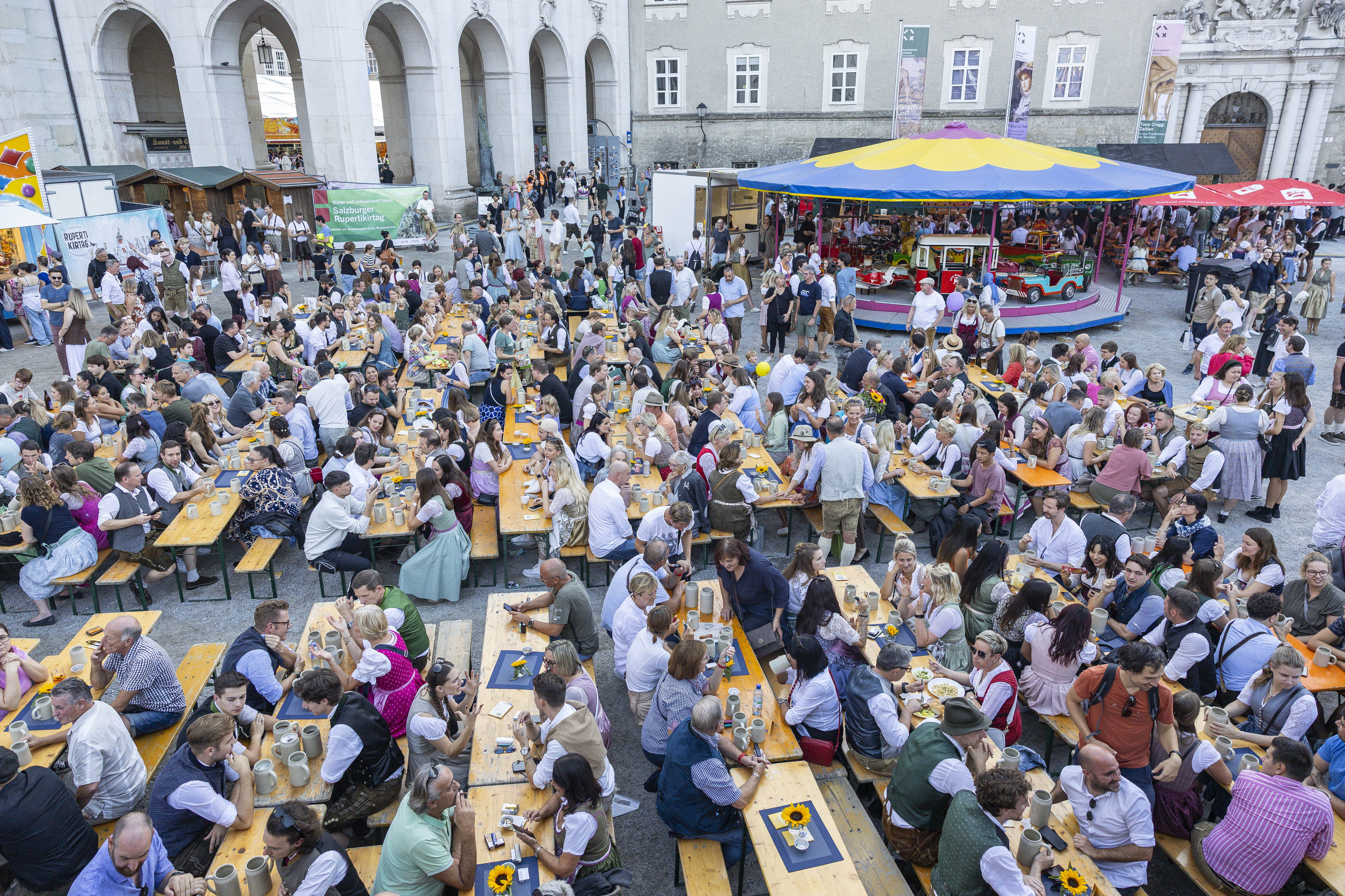 Mit dem Einholen der Marktfahne geht der 48. Salzburger Rupertikirtag heute Mittwoch, 24. September 2025, am Namenstag des Salzburger Landespatrons Rupert, um 22 Uhr zu Ende. Der Altstadtverband Salzburg als Veranstalter freut sich über den großen Erfolg des traditionellen Domkirchweihfestes inmitten der Altstadt und zieht bereits heute Nachmittag eine positive Schlussbilanz. An den sechs Veranstaltungstagen genossen rund 200.000 Einheimische und Stadtbesucher:innen aus dem In- und Ausland das „Fest der Salzburger:innen“ bei perfektem Kirtagswetter, vor allem am spätsommerlichen Wochenende. Bereits am Freitag, am Abend des Eröffnungstages, sowie am Samstag und Sonntag war der Besucher:innen-Andrang am Festgelände rund um den Salzburger Dom besonders groß. Jung und Alt nutzten das schöne Wetter und genossen in vollen Zügen die einzigartige Rupertikirtagsstimmung in der Altstadt Salzburg. „Die große Vielfalt an Volkskultur, Handwerkskunst, Tracht, Musik, Schaustellerei und Kulinarik sorgte auch heuer wieder bei allen Altersgruppen gleichermaßen für viel Begeisterung und Kirtagsfreude. Der Salzburger Rupertikirtag erfreut sich großer Beliebtheit und ist jedes Jahr ein fixer Treffpunkt für Familien und Freunde aus Stadt und Land Salzburg“, erklärt Organisator und Veranstalter Roland Aigner, Geschäftsführer des Altstadtverbandes Salzburg. „Als Veranstalter geht es uns nicht um Besucherrekorde. Die Menschen sollen sich bei diesem generationsübergreifenden Traditionsfest wohlfühlen sowie die friedvolle und fröhliche Stimmung vor Ort uneingeschränkt genießen“, zeigt sich Roland Aigner erfreut über die erfolgreiche Abwicklung der Großveranstaltung und bedankt sich für die gute Zusammenarbeit bei allen Mitwirkenden. Dazu gehören neben dem Organisationsteam des Altstadtverbandes Salzburg ebenso die Betreiber:innen der rund 125 Kirtags-Attraktionen, die teilnehmenden Marktfieranten:innen, Schausteller-, Handwerks- und Gastronomie- sowie Dienstleistungsbetriebe, die Festzeltbetreiber, die Blaulichtorganisationen, das Security-Team, die Salzburger Vereine sowie die Erzdiözese und die Stadt Salzburg. Auch die Bilanz der rund 100 Marktstandbetreiber:innen vor allem der Gastronom:innen fällt zufriedenstellend aus, denn der Salzburger Rupertikirtag 2025 brachte ihnen durchwegs gute Geschäfte. Insgesamt wurden rund 500 Hektoliter Bier (50.000 Maß) beim Salzburger Rupertikirtag 2025 ausgeschenkt.