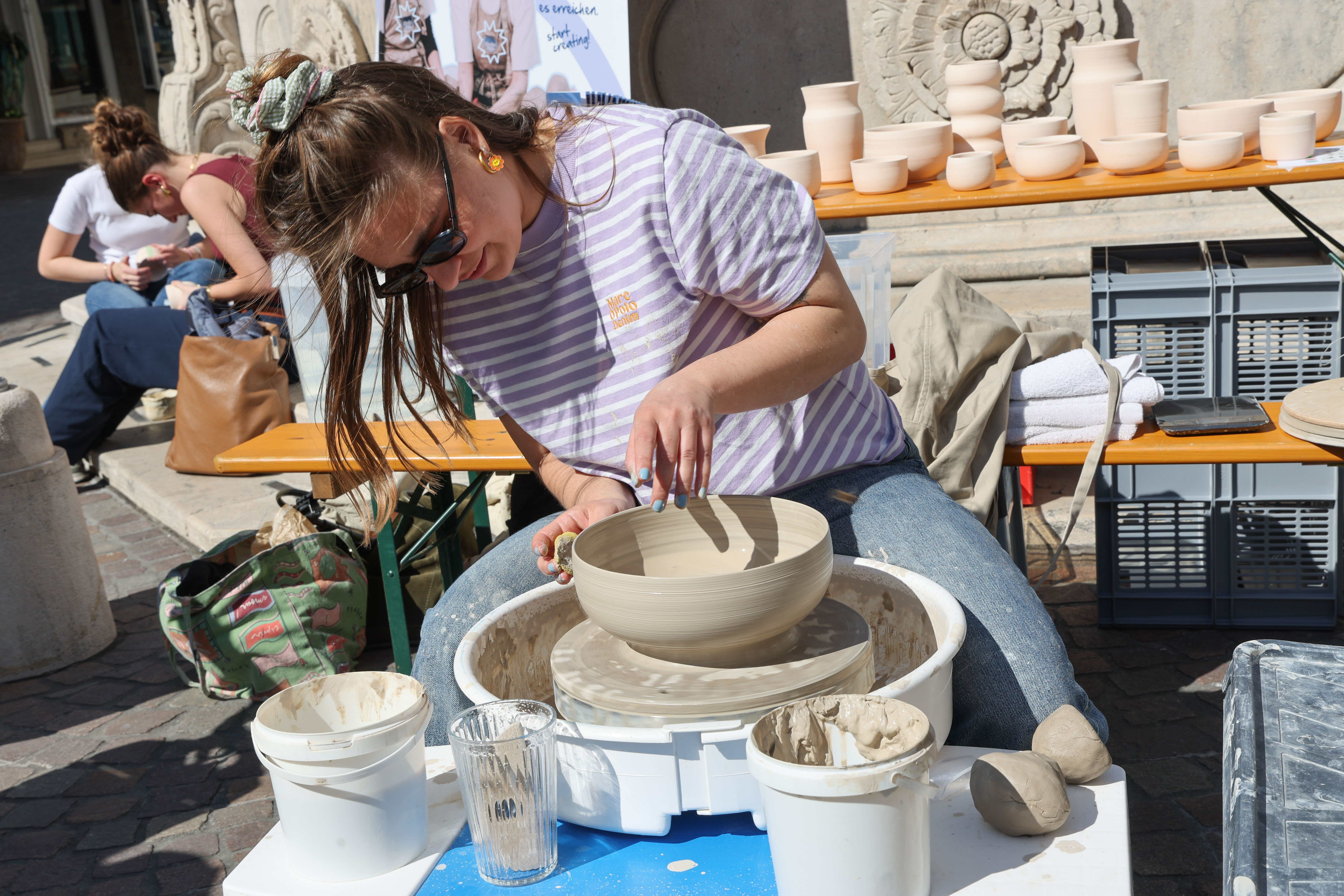 Handwerk einmal anders war vielerorts in der Altstadt zu erleben. Im Rahmen der Open-Air Pop-Ups wie im mobilen Schneiderbus im Innenhof des Bürgerspitals, im Gemini MINT-mobil und im Freiluft-Töpfer-Studio Blau am Alten Markt gab es bei der SOUND.WERK.STADT. Gelegenheit faszinierende Klanginstallationen und kunstvolle Kompositionen aus der Klangwelt des Handwerks in Mülln zu hören.
