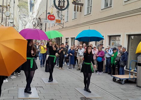 Für Entertainment und überraschende Momente war bei der Stepptanz-Schirm-Show inmitten der Getreidegasse vor der Schirmmacherei Kirchtag gesorgt, als die Irish Beat Factory die farbenprächtigen, handgefertigten Schirme zu abwechslungsreichen Rhythmen tanzen ließen.