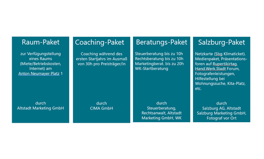 In Kooperation mit der Stadt bietet der Altstadtverband Salzburg den jungen Betriebsgründer:innen kostengünstige Arbeits-, Präsentations- und Verkaufsflächen sowie attraktive Add-ons wie professionelle Beratung, Marketing-Tools und fachkundige Begleitung von etablierten Altstadt-Unternehmer:innen.
