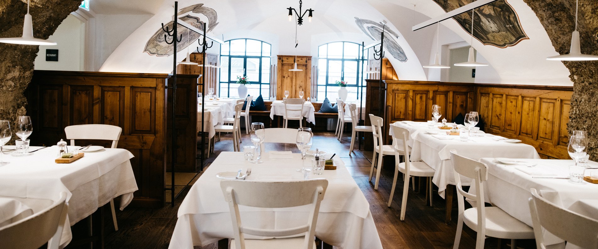 In dem jahrhundertealten Gewölbe mit den original Wandvertäfelungen und Wandmalereien fühlt man sich geborgen, dort wo die gute alte Zeit zuhause ist, und wo man richtig gut essen kann. Die hervorragende Küche zeichnet sich durch schlichte Präsentation und großes Handwerk aus. Die Küche verwendet nur hochwertigste Produkte aus dem Alpenraum, die mit den Aromen und der Leichtigkeit des Südens kombiniert werden, was sie ziemlich salzburgerisch macht.