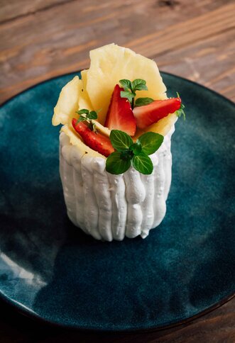 Martin Studeny interpretiert die Pavlova modern und verwendet statt der Sahne Erdbeercreme und Ananascreme mit Zitronengras. Dekoriert wird sie anschließend mit marinierter Ananas.