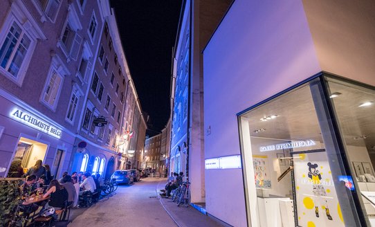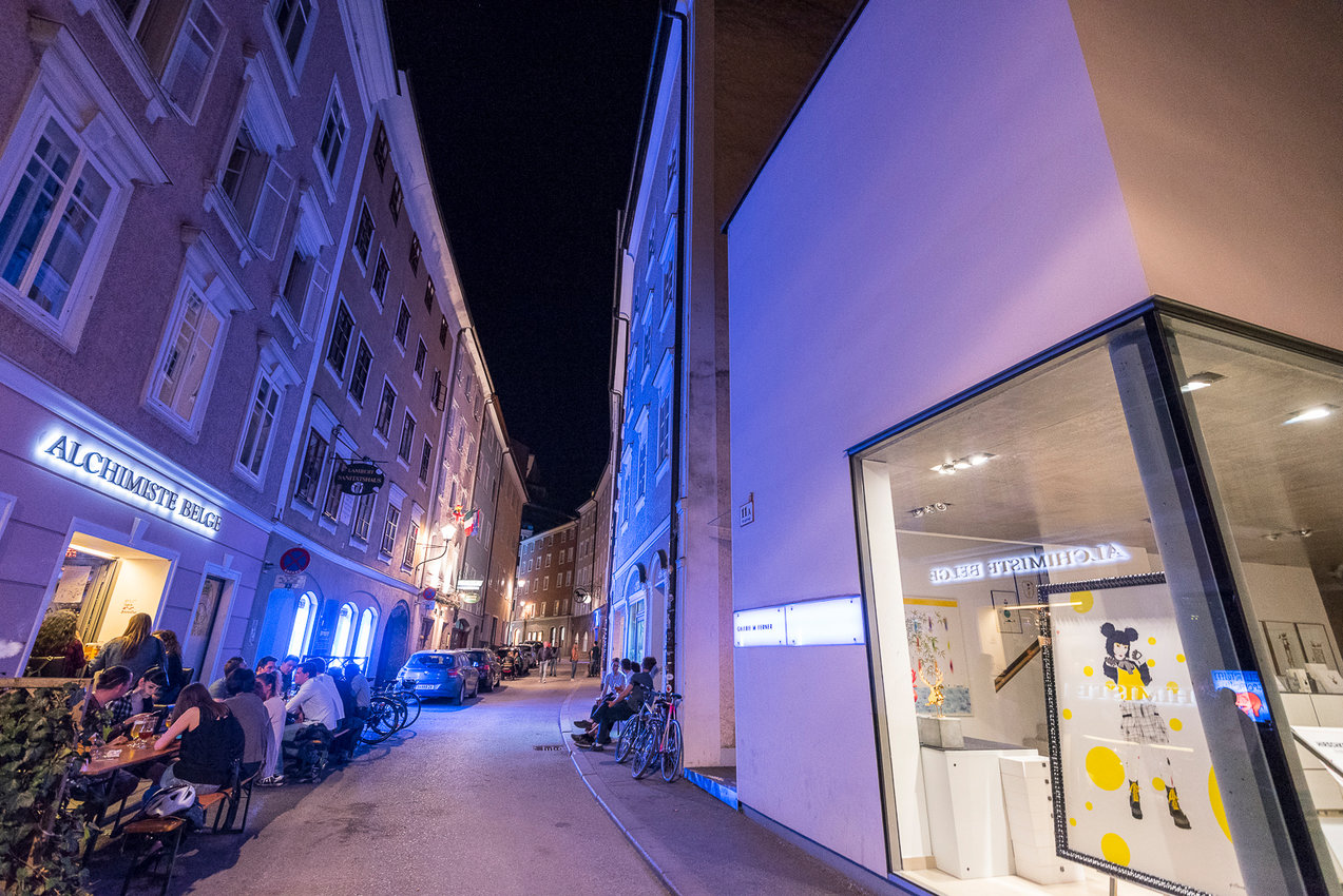 Mittelalterliche Häuser prägen die Bergstraße in der Altstadt Salzburg. Sie sind aber nicht der Grund, warum so viele Salzburger und Gäste diesen Ort aufsuchen. Es sind die Kunstgalerien, die sich die Gasse mit vielen stylishen Bars und Beisln teilen.