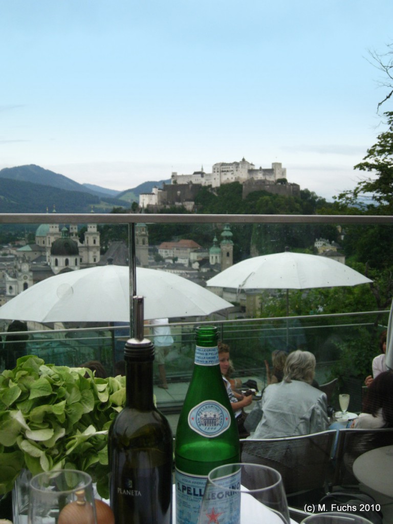 Auf der Terrasse des Haubenrestaurants im Hotel Schloss Mönchstein finden 35 Personen Platz, um über den Dächern Salzburgs die gehobene Küche des Restaurants zu genießen.