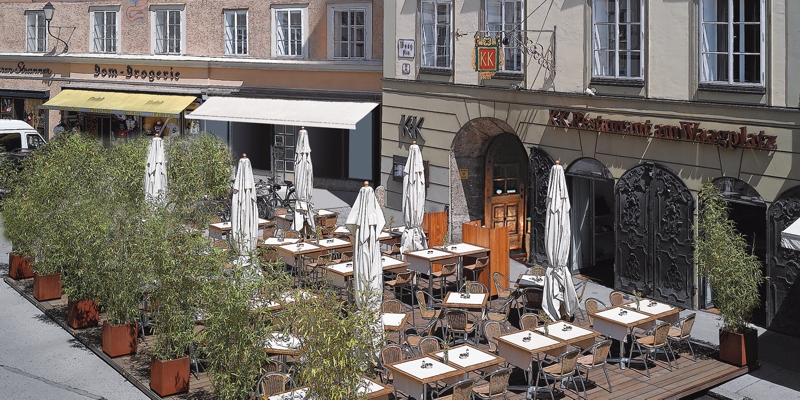 Auf dem Holzdeck direkt neben dem Mozartplatz und dem Dom findet sich der stimmungsvolle Gastgarten des K+K Restaurants am Waagplatz - mit 120 Sitzplätzen und Blick auf das Mozart-Denkmal.