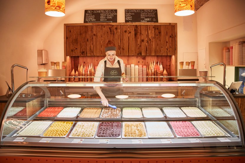 Der Durchgang von Hausnummer 22 beherbergt seit Frühjahr 2017 Österreichs 1. Bio-Schafmilch-Eissalon, der vom Falstaff bereits unter die Top 3 der beliebtesten Eissalons Österreichs gewählt wurde. Nicht nur Menschen mit Kuhmilchunverträglichkeit kommen bei dieser Auswahl aus klassischen wie extravaganten Eissorten auf den Geschmack. Cremig, vollmundig, mit leichter Mandelnote munden Vanille und Schokolade, ebenso wie Heidelbeer-Rosmarin und Graumohn. Ganz nebenbei ist es auch noch sehr bekömmlich. On top: Schokosauce in Bio-Qualität.