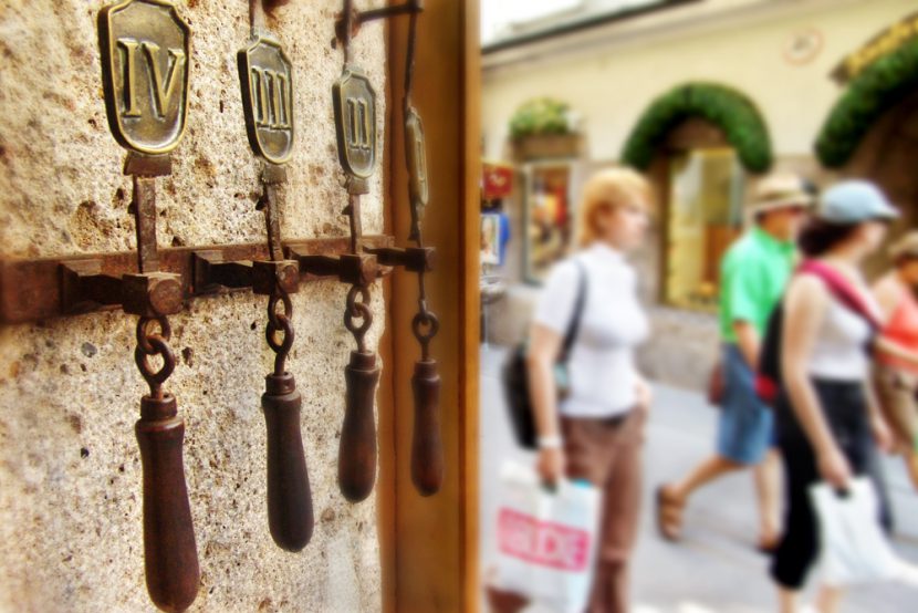 Neben der 400 Jahre alten Eingangstür des Spirituosengeschäfts Sporer befindet sich eine sehenswerte Klingelanlage, die in alle Etagen reicht und bis heute funktioniert. In Betrieb ist nur mehr jene mit der man im Büro bei Sporer anklingelt. Die anderen Klingelzüge führen zu Gästezimmern des Hotels Goldener Hirsch und wurden vorsorglich deaktiviert. Mit einem Zwirn wurde früher der Schlüssel hinuntergelassen. Quasi ein Türöffner der historischen Art. Auch an Mozarts Geburtshaus befindet sich noch ein schmucker Klingelzug. Wer weiß welche Klingel man ziehen müsste, um bei Familie Mozart zu klingeln?