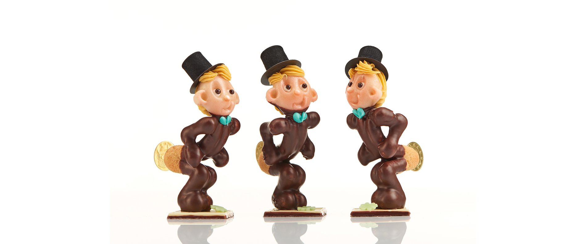 Im Braun‘ schen Panoptikum treten zu Ostern der Figaro, Purple Haze, Rocky, Coco Chanel auf – Coco selbstverständlich mit der legendären Perlenkette. Karl Lagerfeld hätte seine Freude daran gehabt. In der Adventszeit erscheinen dann der Nikolo und die Kramperl, zu Silvester dann der Geldscheißer. Ein weiterer „roter Faden“ im süßen Universum von Gerd Braun sind die regionalen Bezüge: Der Florentiner, ein Gebäck mit Mandeln, ist der keltischen Scheibenfibel, einem Schmuckstück, nachgearbeitet, die sich im Halleiner Keltenmuseum befindet. Im Pralinensortiment wird auf Paracelsus verwiesen – „Die Dosis macht das Gift.“ Aus Mandeln und Honig werden die Rupertistangerl gemacht – ein Gruß an den Heiligen Rupertus, den ersten Salzburger Bischof.