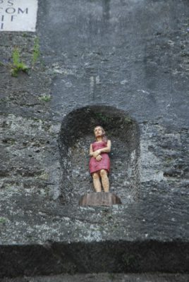 Beide Figuren enthalten uns ihre Geschichte vor, sie sind zunächst einmal, was wir sehen. Ein überlebensgroßer Mann auf einer Kugel und eine unterlebensgroße Frau in einer Felswand. Ob mehr dahinter steckt – ein kunsthistorisches Zitat, ein religiöser oder politischer Kommentar – lässt der Künstler bewusst offen. Vorhang auf für den/die BetrachterIn!