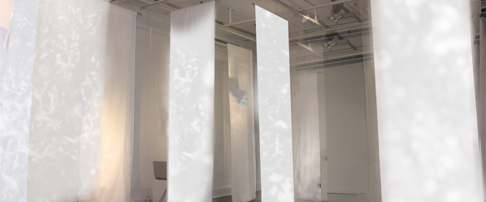 Eine Ausstellung von Gertrud Fischbacher & Marius Schebella mit Installationen von 20 bedruckten Stoffbahnen.