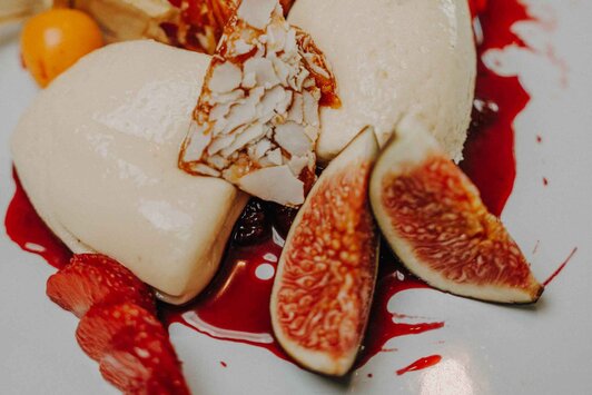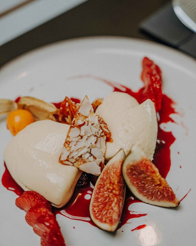 Die Zutaten, die das Küchenteam auswählt, sind an sich schon ein Fest für die Sinne. Ob mit Jakobsmuschel, Lammfleisch, roter und gelber Bete, Kurkuma, Yuzu, Orange, Rhabarber oder Grapefruit: Die Gerichte werden frisch, fruchtig, herzhaft, süß und ebenso farbintensiv wie Julia Franziska Kesers Kunstwerke.