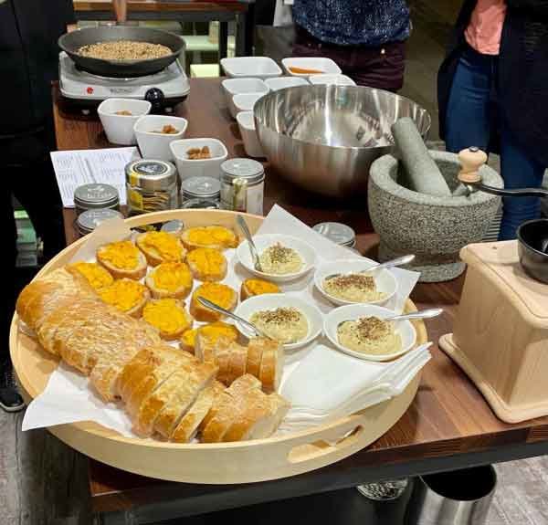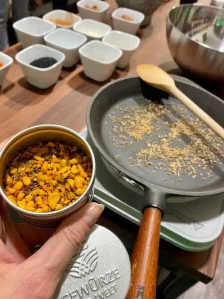 Wir begrüßen euch mit einem Glas Crémant und würzigen Häppchen, um den Abend einzuläuten. Schnupperproben begleiten unsere einleitende „kleine Gewürzkunde“. Themen sind hierbei nicht nur die ausgefallensten Gewürze vom anderen Ende der Welt, sondern auch Unbekanntes aus Europa. All diese Gewürze stehen zum Beschnuppern, Befühlen und Probieren bereit. Im Seminar stellen wir gemeinsam eine typische Mischung her, wie ein Masala, ein Rub oder ein Curry, die ihr selbstverständlich mit nach Hause nehmen dürft. An unserer Kochstation zeigen wir euch Tricks und Kniffe, so dass ihr mühelos würzige Kleinigkeiten selbst zuhause zubereiten könnt.